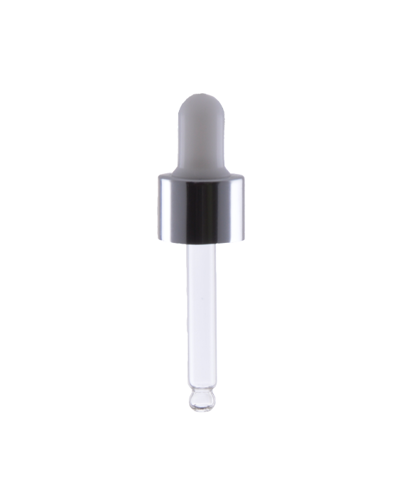 • Szklana pipeta z białą ssawką i aluminiowym, srebrnym kołnierzem. Silikonowa ssawka jest trwała i wygodna w użyciu. Produkt do serum, olejków i wielu innych kosmetyków.